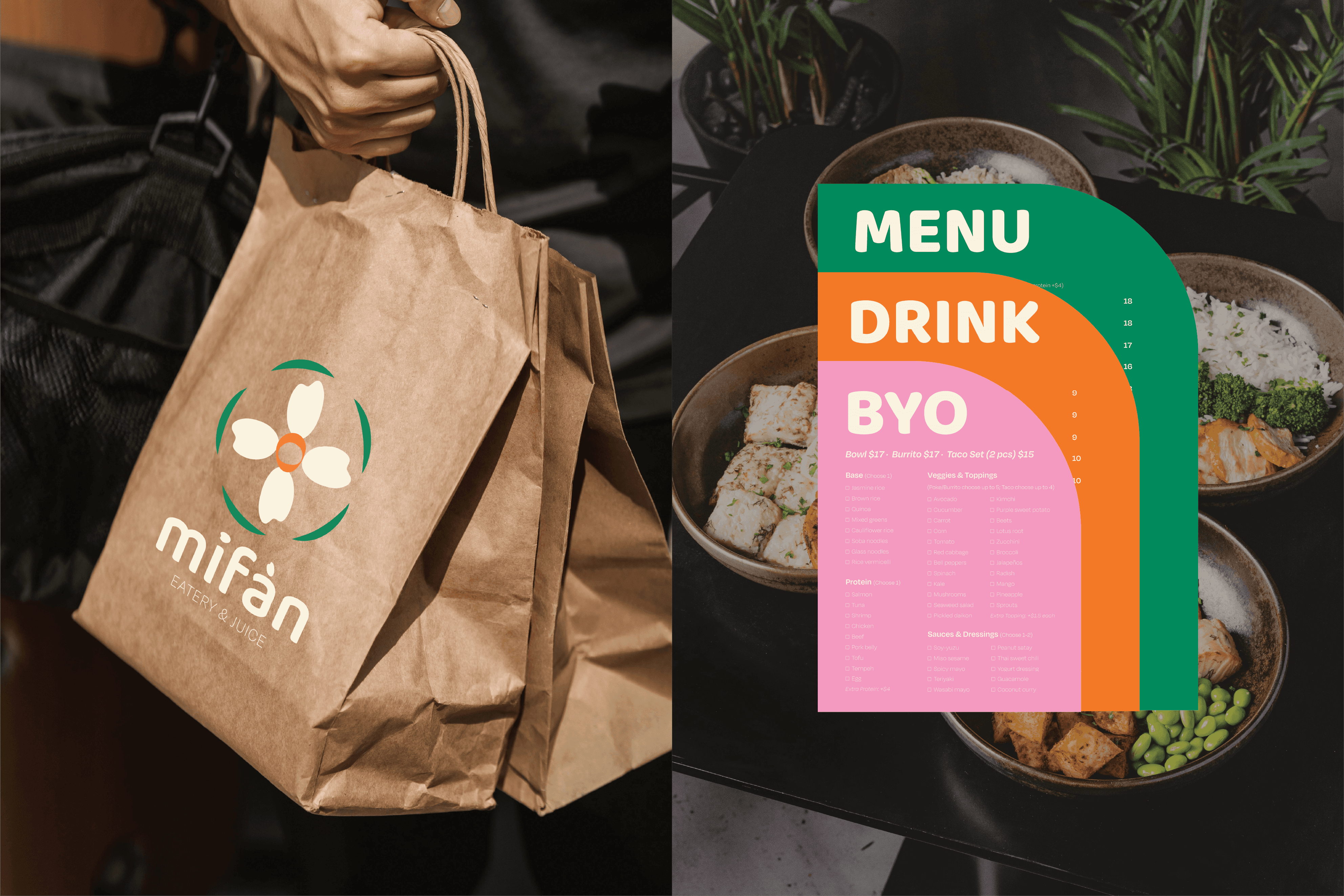 Mifan is a modern light food restaurant built around the Chinese word "mǐfàn" — rice. The name bridges cultures through sound and meaning, and the brand needed to match: culturally rooted, but fresh and accessible enough to welcome a new generation of diners across poke bowls, burritos, sushi tacos, and fresh juices.