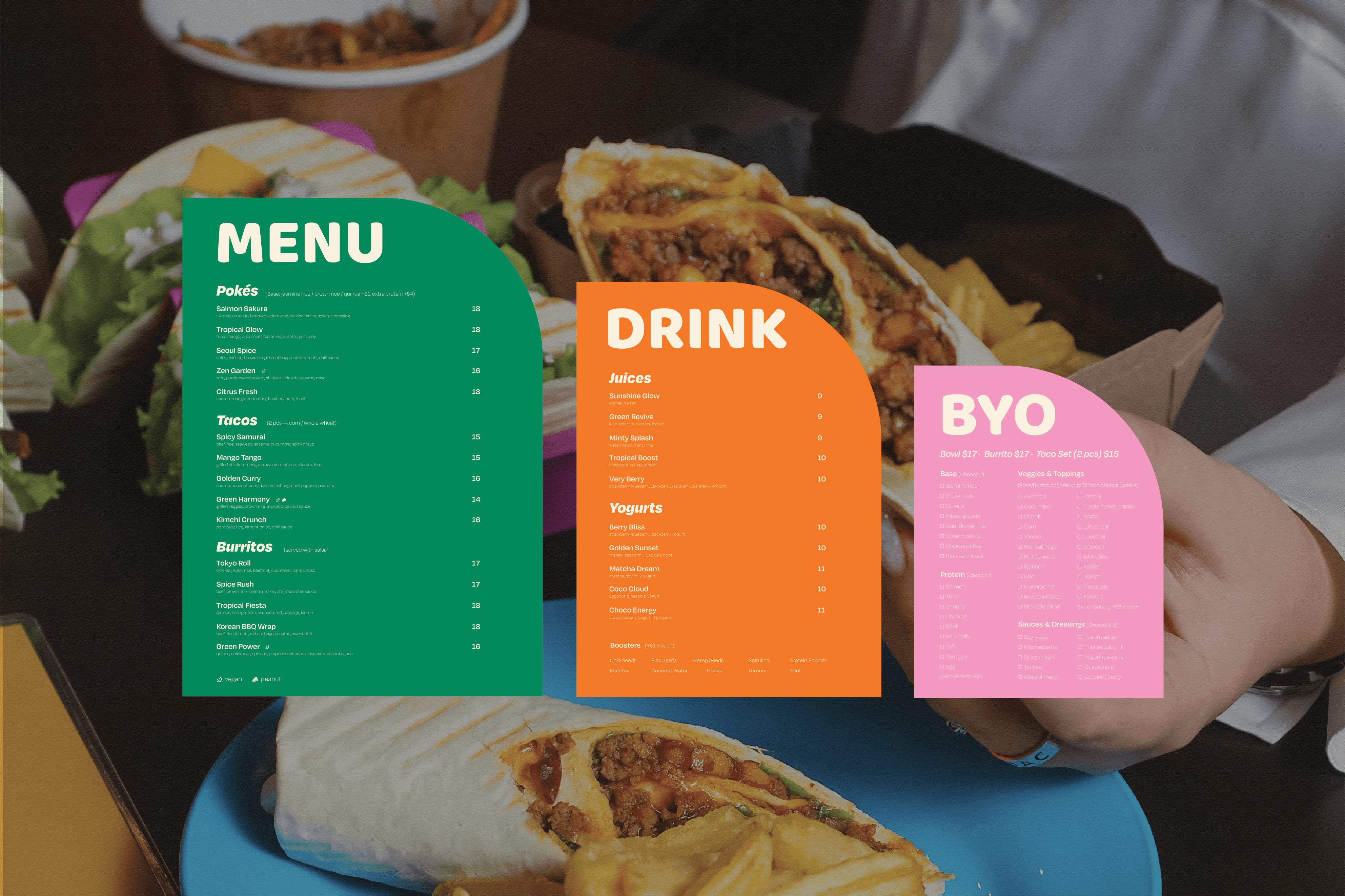 The restaurant concept was genuinely new — a fusion dining format that didn't fit neatly into any existing visual category. The brand couldn't look like a Chinese takeout, a poke chain, or a fast casual burrito spot. It needed its own language.